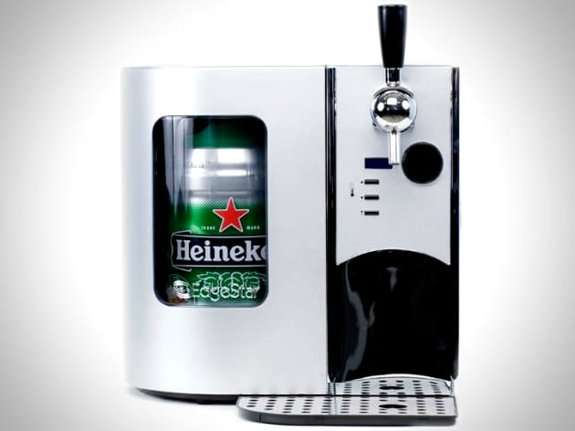 Most men prefer the taste of draft beer over any form of bottled hops. Acquiring a keg makes for an epic weekend, but is expensive, and not very portable. The Edgestar Mini Kegerator provides you with draft beer goodness, while being portable enough to carry to a tailgating party or over to your neighbor’s pool while they’re out of town. With electronic temperature controls for maintaining optimum drinking temperatures, the Mini Kegerator utilizes an advanced Pressure Technology dispensing system for tapping into a Heineken DraughtKeg. If you prefer domestic beer instead, an optional CO2 kit is available for tapping into any other 5-Liter Keg you can find—and if you prefer not to drink draft beer at all, then enjoy your PBR in a can and check out our Beer Stuff instead.