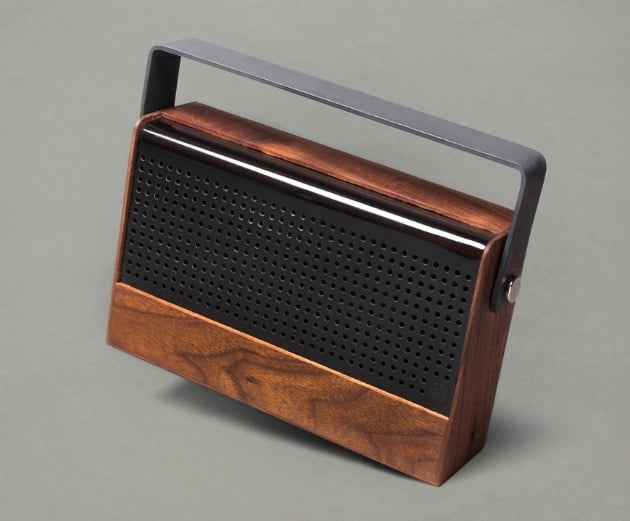 The Kendall Portable Wood Speaker ($188) is a perfect union of style and function. It is housed in a solid walnut casing, with a laser-etched acrylic speaker grill that covers a couple of fullrange 2-inch speakers, powered by a class D amplifier. Other features include a 4-hour run time on the lithium battery, a 9V wall adapter, Bluetooth compatability for listening to your playlists on the go, and iPhone alarm clock capability via a free app.